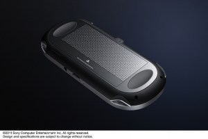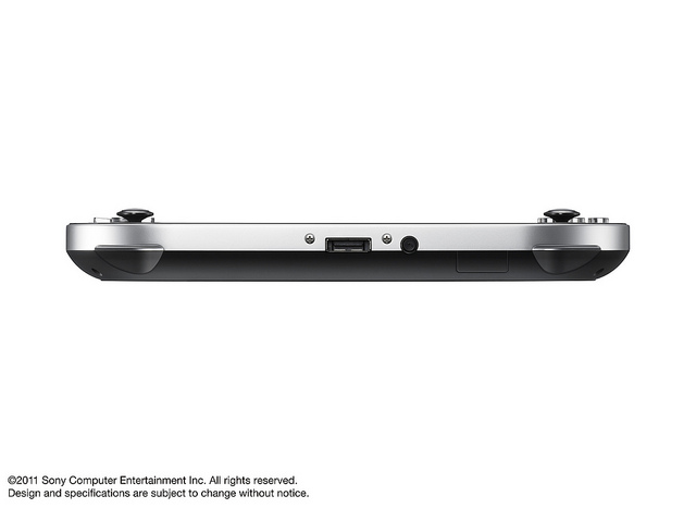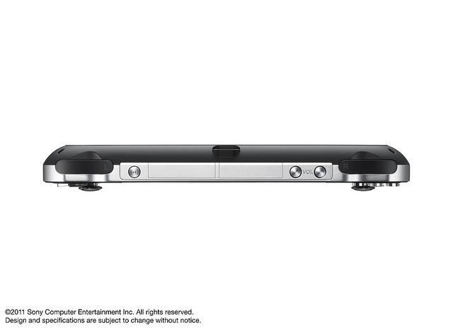 The top is more exciting, we can see the better designed shoulder buttons (with indents behind them) as well as the new buttons. The buttons for Power and volume are just that, buttons. They remind me of cell phone buttons but does raise a question, what about standby/sleep mode? On the PSP you could move the slider to standby or off, here there is just power. Hopefully there is a standby mode accessible via the PS button? Maybe a 3DS style suspend mode?