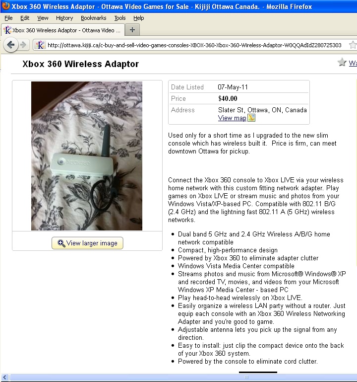 It’s always interesting writing a Kijiji ad for anything. I finally got a new Xbox 360 after my last one RROD 6 or so months ago, the newish 4GB slim was on a 70 dollar off sale and I figured what the hell. The big benefit is that the new model has built in wireless which meant I no longer needed the wireless adaptor I had for my original x360. So off I went and created the ad to sell this still viable piece of hardware:
