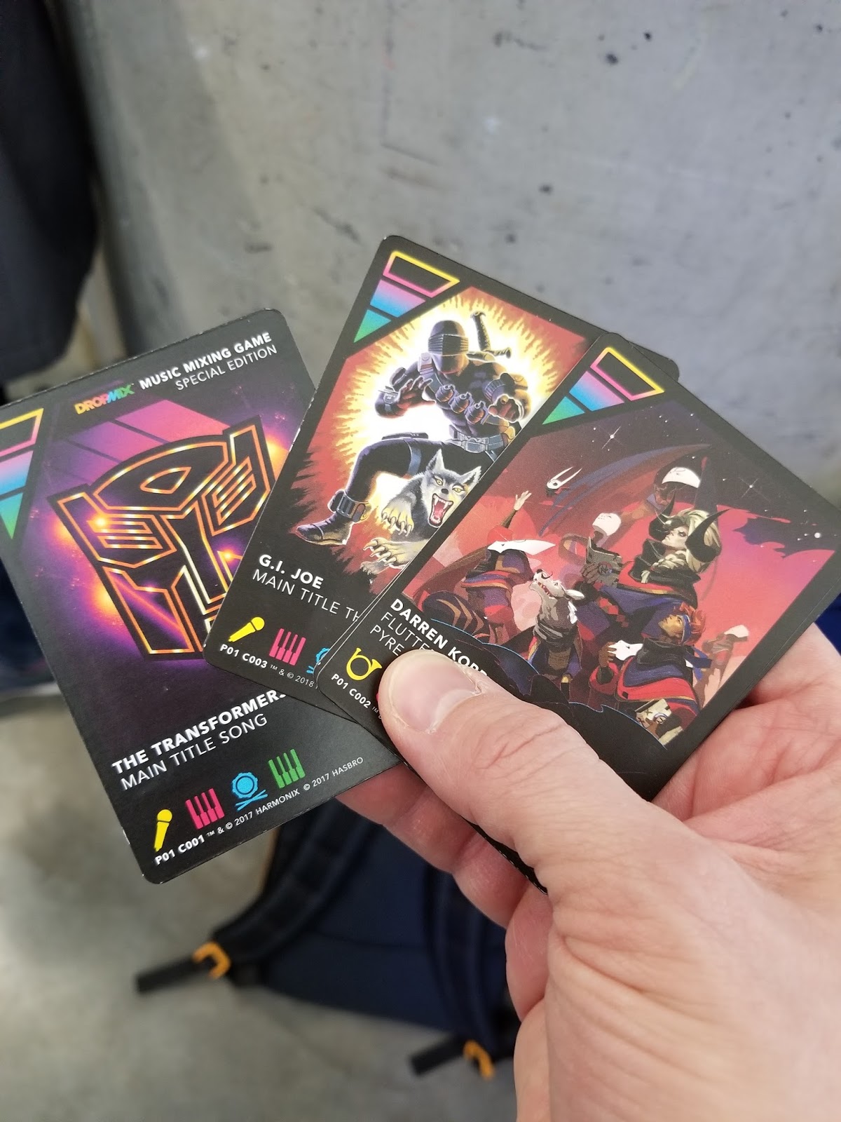 The game has been out for a while so there are tons of core cards and expansion packs to choose from but as an electronica/dance fan I was excited to hear that a Chiller pack is coming out in May that will add songs from The Chainsmokers, Afrojack, Odesza and more to the lineup. These cards were at the DJ station I tried the game at and were really cool to add to the mixes. They also often release promo cards, at PAX East they have a card featuring music from Supergiant’s recent game Pyre as well as the G.I. Joe theme song.