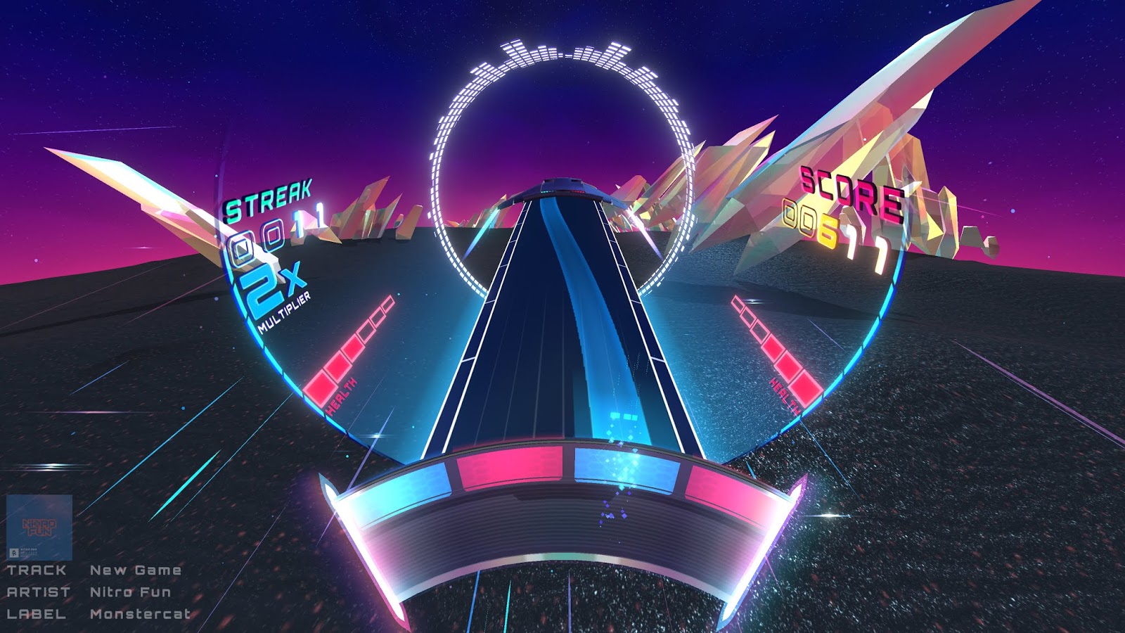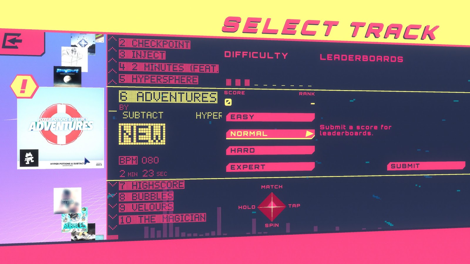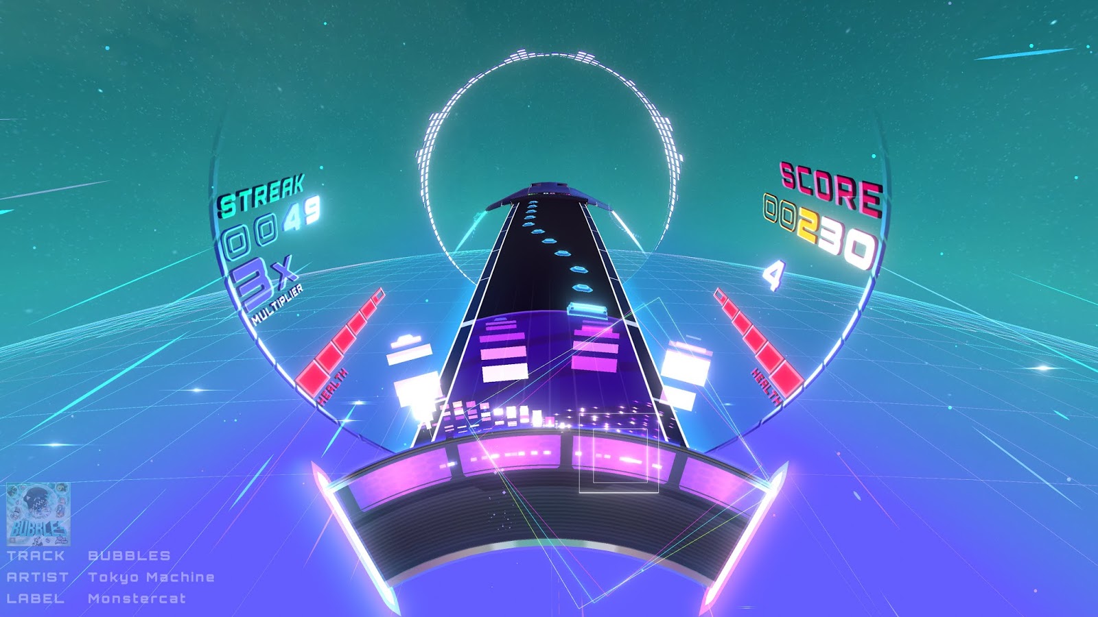 As mentioned spinning is the key mechanic as only two colored notes flash by in the form of blue and red. The main trick is to spin (I found analog sticks on a controller the best way) to align the colors and collect all the beats. At times a fast spin in either direction is also cued usually triggering a sustained beat.