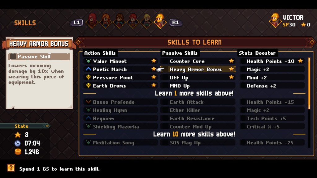 This simple system adds a ton of strategy and nuance to battles, especially the longer boss encounters. Round to round different abilities will be tagged to reduce the bar, while others increase it. This makes decisions to heal, attack or defend crucial to finishing some encounters. The system is not perfect but it does add a great strategic element that gets deeper as more skills are obtained.