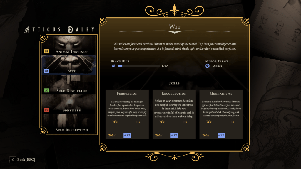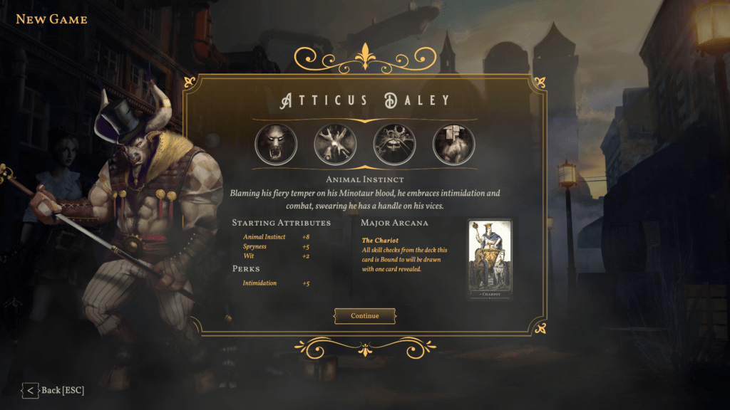Actions are purely based on skills from picking or forcing locks to bluffing my way past some nosy guards. As a scenario dictates a pool of tarot cards are drawn and the chosen card augments the skill to determine success or failure. Like in the aforementioned Disco Elysium failure is not always a bad thing as it could augment certain attributes.