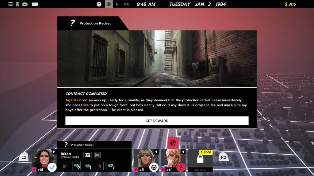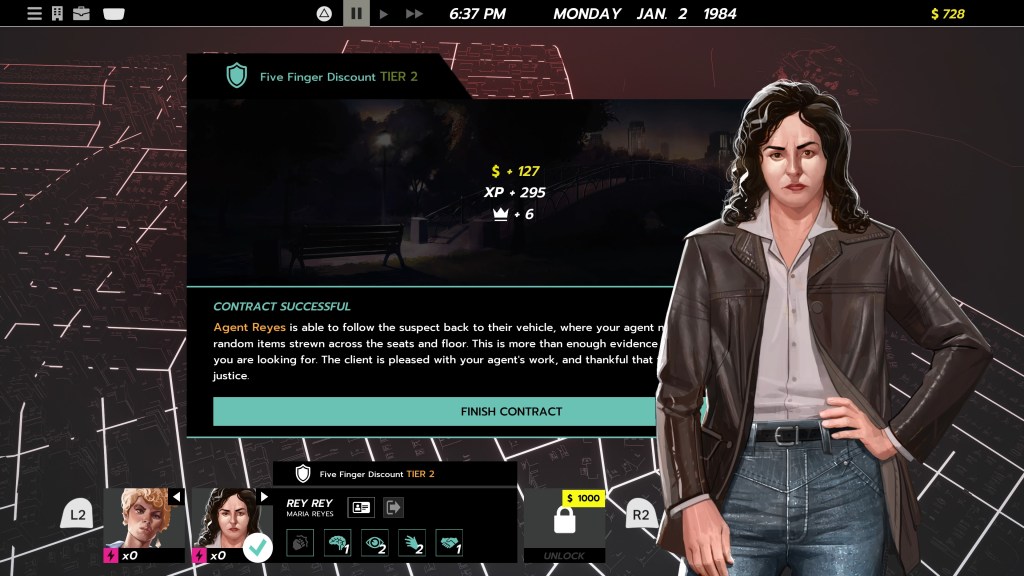 Odd decisions like not automatically pausing when editing an agent, not moving directly to upgrade screen during a level up or the pure silliness of gatekeeping story missions behind levelling up contacts ultimately take some of the fun out of Rough Justice: ’84