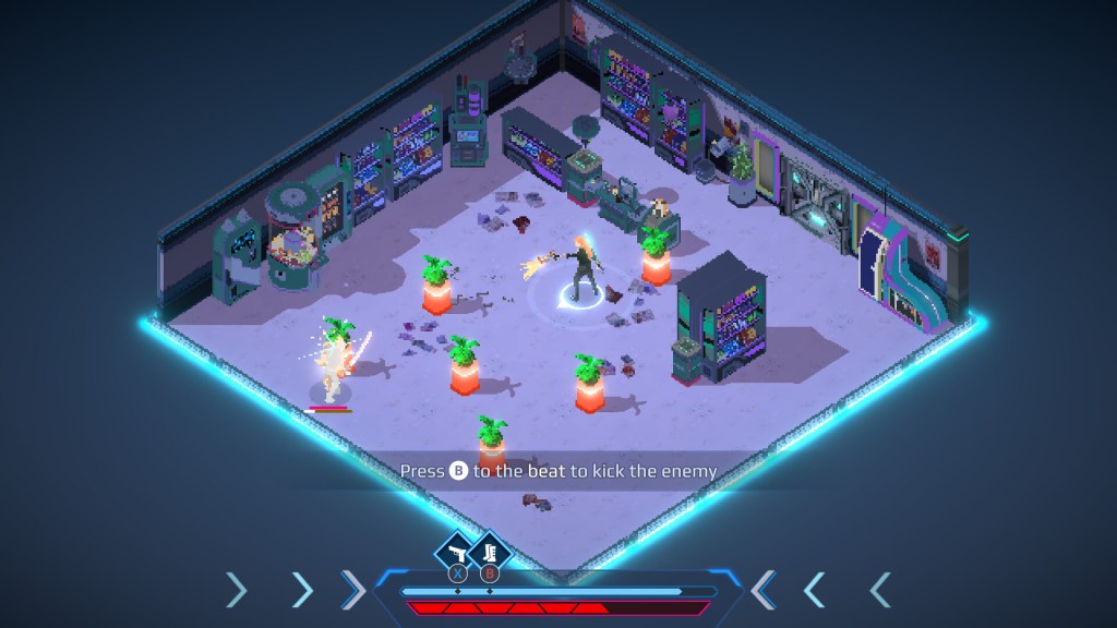 Thankfully the reloads after death are near instantaneous so it never felt like s alog to try again. Add to the complexity of the beat system the enemies also have differnt attak patterns. Some strike once, others multiple times in a row while others block or shoot their own guns.