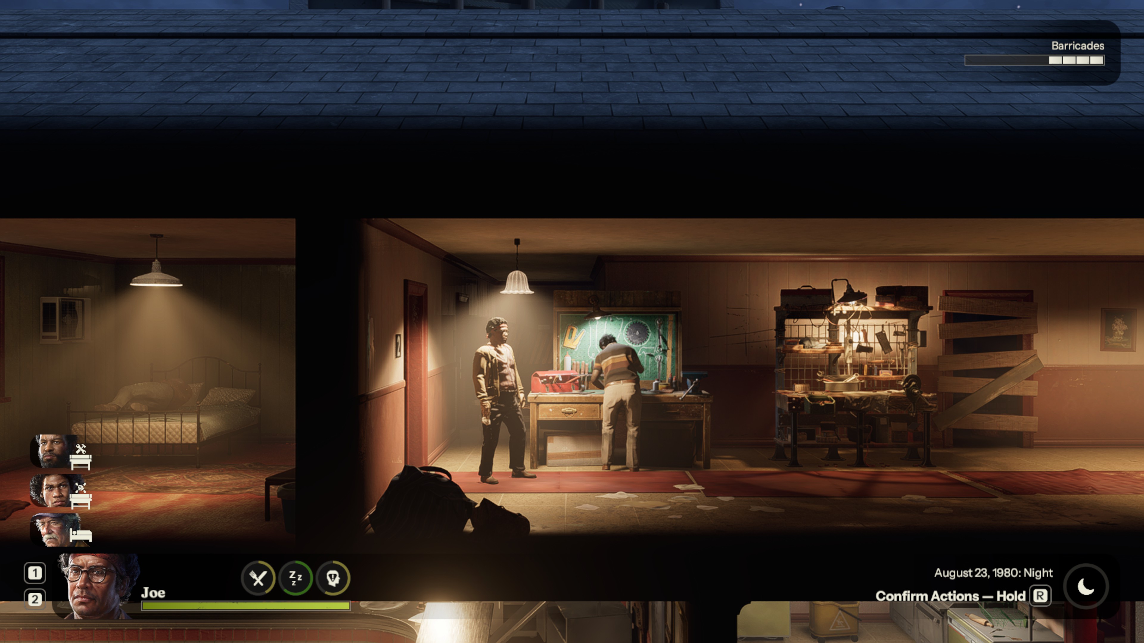 Then the game starts in earnest with the pair in a boarded up location with very little supplies, the key task is to scavenge nearby locales to find necessary supplies and amore secured hideout. There is a day and night cycle and each survivor can be assigned a task during each of these allowing base improvement and scavenging to happen simultaneously.