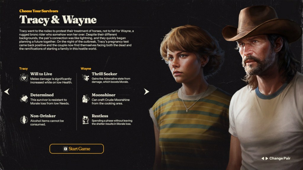Into the Dead: Our Darkest Days always starts with a choice of a pair of survivors to start the scenario with. These people tend to have differing skills that will add certain benefits to the run, whether it is an iron stomach, larger backpack or better moral recovery, every little bit helps.