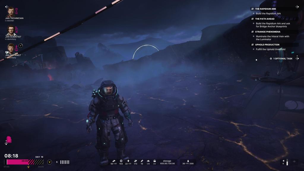 Each time a new area is discovered we, as the original Jan acting as de facto Captain, needs to explore, set up mining sites and find materials and secrets. This involves moving about the planet during daytime hours scanning mining areas, gathering loose materials, setting up facilities and finding secrets and rare personal items.