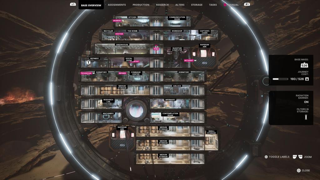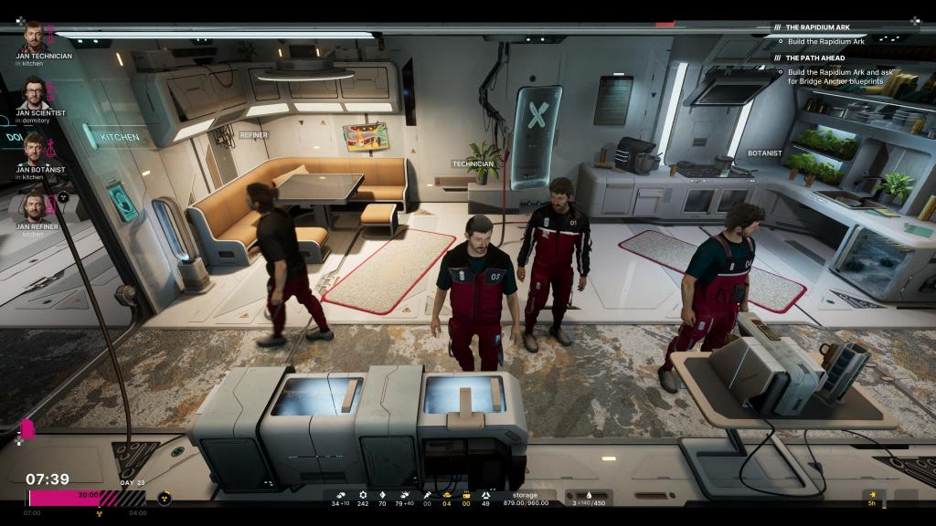 Once modules like the Kitchen, Research lab, Refinery and others are created Alters or the Player as Jan can be assigned there and work on whatever is queued up. The game has a great centralized menu to add production and assignments for the Alters, but each Module can be explored and manually accessed to queue up work that is required.
