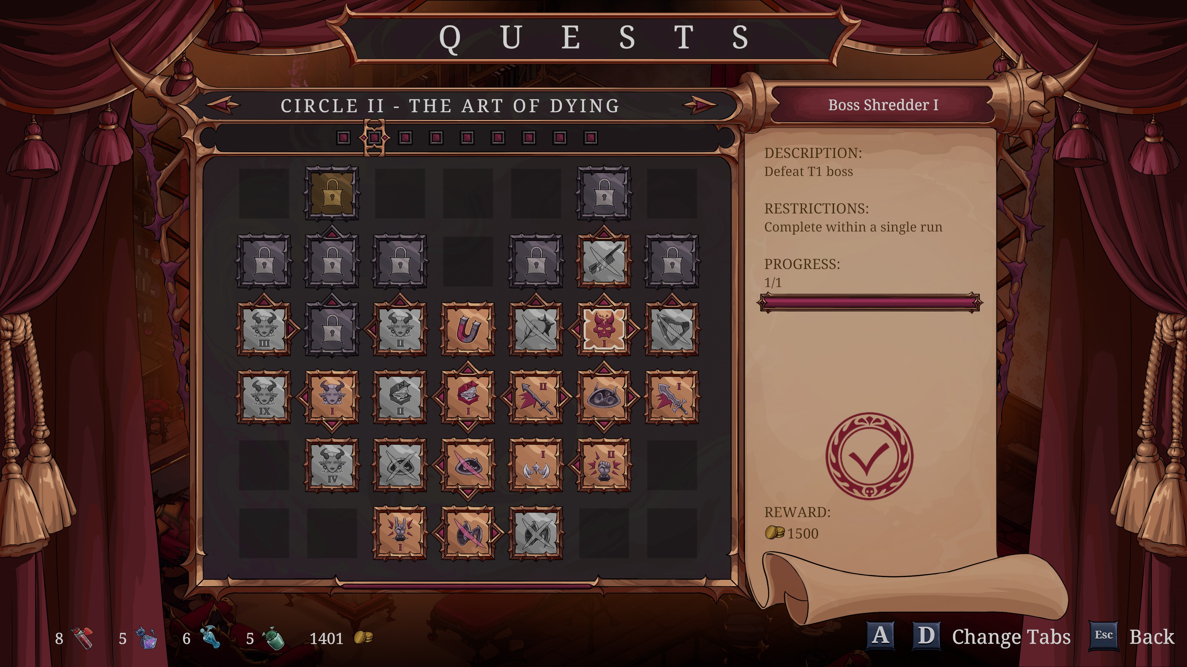 Aside from buying some upgrades, which I maxed out in a few runs, changing between two characters and checking quest progress which unlocks resources and new Sins (powers) findable in a run there is not much to do in the HQ. The real (and only) meat to the game is the Runs.